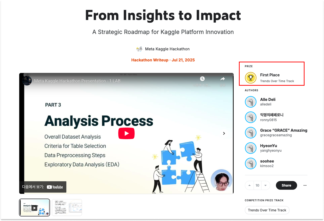 최종 프로젝트 직후 7일간 몸살을 앓을 정도로 모든 걸 쏟아부었고, 캠프 수료 후에도 팀원들과 2주간 추가 작업을 통해 프로젝트의 완성도를 높여 캐글 해커톤에 출전했어요. 그 결과, 캐글 해커톤에서 무려 1등을 할 수 있었고, 문과 출신으로 숱한 어려움을 헤쳐온 저에게 정말 잊지 못할 벅찬 경험이 되었죠.